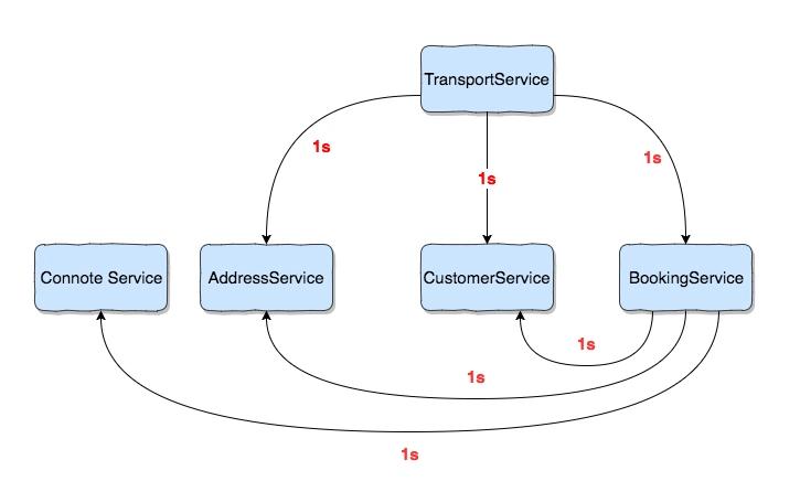 Unsere Applikation wurde nun in mühevoller Handarbeit oder mithilfe eines automatisierten Build- und Deployprozesses auf unseren Server installiert. Wie ihr vielleicht festgestellt habt, hat unser BookingService ein Problem! Er wird vom TransportService aufgerufen und hat dabei 1 Sekunde lang Zeit zu antworten. Der BookingService muss aber den ConnoteService, AddressService und CustomerService aufrufen. Diese 3 genannten Service haben jeweils auch 1 Sekunde lang Zeit zu antworten. Wenn sie das aber nicht deutlich unter 1 Sekunde geschafft haben, wird Hystrix den Aufruf vom TransportService zum BookingService abbrechen und einen Fallback liefern.