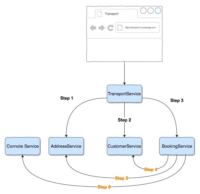 Die Steps 4 bis 6 werden von BookingService parallel durchgeführt und an den TransportService zurückgemeldet, dieser meldet die erfolgreiche Verarbeitung dem Kunden.
