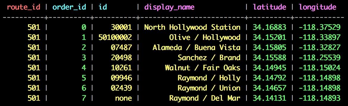 Diese Datenbeinhalten die ID der Route und die entsprechenden Bushaltestellen inklusive Geokoordinaten. Zu jeder Route gibt es noch den Namen der Route, wie er am Bus angezeigt wird.