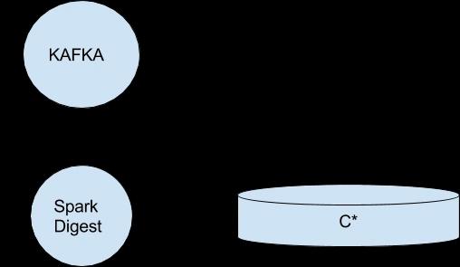 Der Digest liest die Daten aus Kafka, verarbeitet diese mit Spark und schreibt die Positionsdaten aufbereitet sowohl in Cassandra als auch Kafka. In diesem Schritt werden die Positionsdaten für die Abfragen aus dem Frontend optimiert abgelegt.