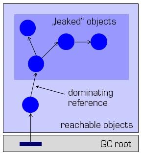 Im Zusammenhang mit Memory Leaks wird oft auch von so genannten Dominatoren oder Dominator Trees gesprochen. Das Konzept der Dominatoren kommt aus der Graphentheorie und definiert einen Knoten als Dominator eines anderen Knotens, wenn dieser nur durch ihn erreicht werden kann. Auf das Speichermanagement umgesetzt ist also ein Objekt A ein Dominator eines anderen Objekts B, wenn es kein weiteres Objekt C gibt, das eine Referenz auf B hält. Ein Dominator Tree ist dann ein Teilbaum, in dem diese Bedingung vom Wurzelknoten aus für alle Kinder gilt. Wird also die Wurzelreferenz freigegeben, wird auch der ganze Dominator Tree freigeben. Sehr große Dominatorenbäume sind also sehr gute potenzielle Kandidaten bei der Memory-Leak-Suche.