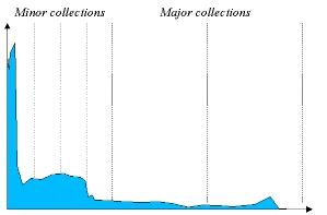 Aus diesem Grund sind die Garbage Collection Algorithmen so entworfen, dass Young Colections möglichst schnell durchgeführt werden können. Rechts ist ein Diagramm aus der Oracle Dokumentation abgebildet, welcher die typische Altersverteilung von Objekten zeigt. Viele Objekte leben nur sehr kurz und einige für eine gewisse Zeit und überleben 2-3 Young Generation Collections (auch Minor Collections genannt). Aus diesem Grund kopiert die Young-Collection die überlebenden Objekte in sogenannte Survivor Spaces. Dort bleiben sie biss sie „alt genug“ sind und in den Old Bereich verschoben werden. Der genauen Funktionsweise ist geschuldet, dass zwei Survivor Spaces existieren, von denen einer immer leer ist. Der verbleibende Bereich der Young Generation wird Eden genannt.