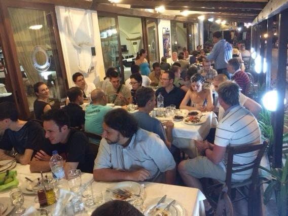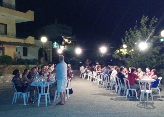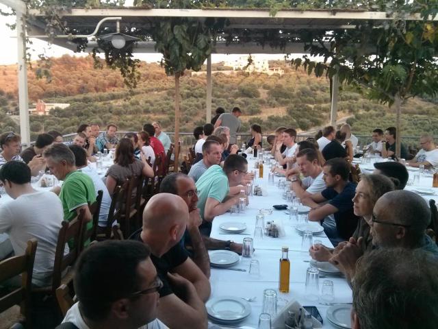 Da wir alle „Speaker“ waren, fand jeden Abend ein Speaker Dinner statt. Es wurden typische griechische und kretanische Spezialitäten von mit Heinz befreundeten Lokalbesitzern serviert. Mit rund 100 hungrigen Mäulern waren wir sicherlich auch eine große Attraktion für die beschaulichen Gaststätten. So dinierten wir am Dienstag Abend in dem kleinen Dörfchen Afrata, dessen Einwohner uns kurzerhand eine Tafel auf dem Dorfplatz aufbauten um uns bewirten zu können. Es war immer sehr lecker und es gab auch reichlich Raki — Yammas!