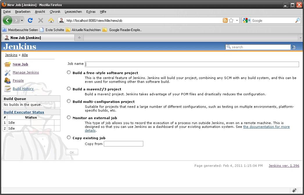Dies vereinfacht die Migration von Hudson auf Jenkins natürlich enorm und ist auch auf einer Linie mit der entsprechenden Upgrade-Dokumentation auf der Jenkins Homepage . Das Anlegen von neuen CI-Aufträgen kommt ehemaligen Hudson-Benutzern mehr als nur ein wenig vertraut vor. Für neue Benutzer wird nach wie vor die Einfachheit mit der neue Jobs erzeugt werden können ein starkes Argument für Jenkins sein