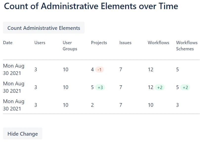 Bevor es richtig losgeht, sollte der Ist-Stand der Jira-Instanz genauer betrachtet werden. Dies hilft dabei, Problembereiche zu identifizieren und nach dem Cleanup Verbesserungen zu erkennen. Um die Anzahl der einzelnen administrativen Elemente nicht einzeln heraussuchen zu müssen, haben wir in Jira Cloud eine kleine App gebaut, die derzeit gratis vom Atlassian Marketplace zu installieren ist. Die App zeigt auf Knopfdruck die Anzahl aller administrativen Elemente. Diese Werte werden gespeichert, womit in der Tabelle auch die Differenz zum letzten Messpunkt angezeigt werden kann.