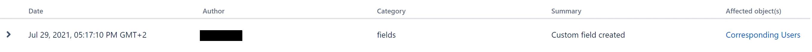 - Suche nach Summary: „Custom field created“ und Freitext „“