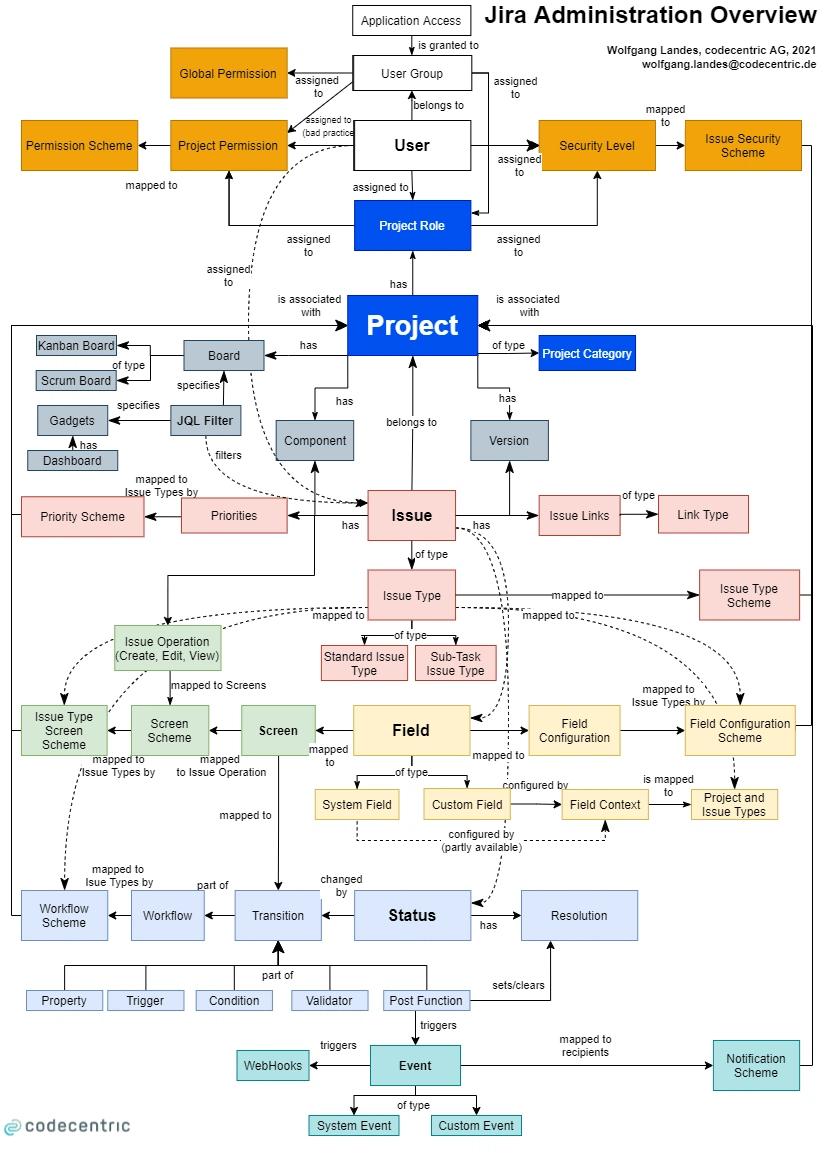 Einen Überblick über Abhängigkeiten administrativer Elemente bietet die folgende Grafik, die wir bei codecentric auch für Admin-Schulungen in Jira einsetzen.