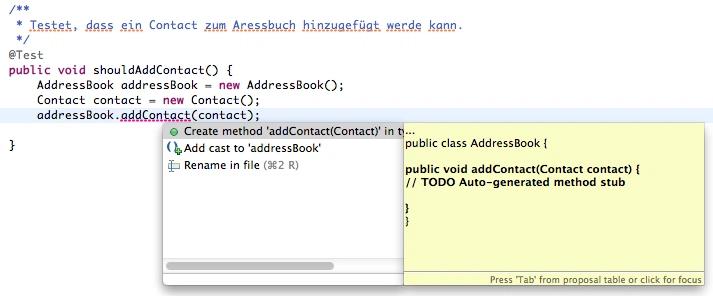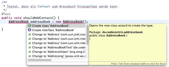 Wie man in obigem Screenshot sieht, zeigt Eclipse in der ersten Zeile der Testmethode einen Fehler an, weil die Klasse AddressBook, die getestet werden soll, nicht existiert. Mit Ctrl-1 öffnet man das gezeigte Kontextmenü und kann die Klasse über „Create class…“ erzeugen. (Im Dialog darauf achten den Source Folder auf src/main/java zu ändern)