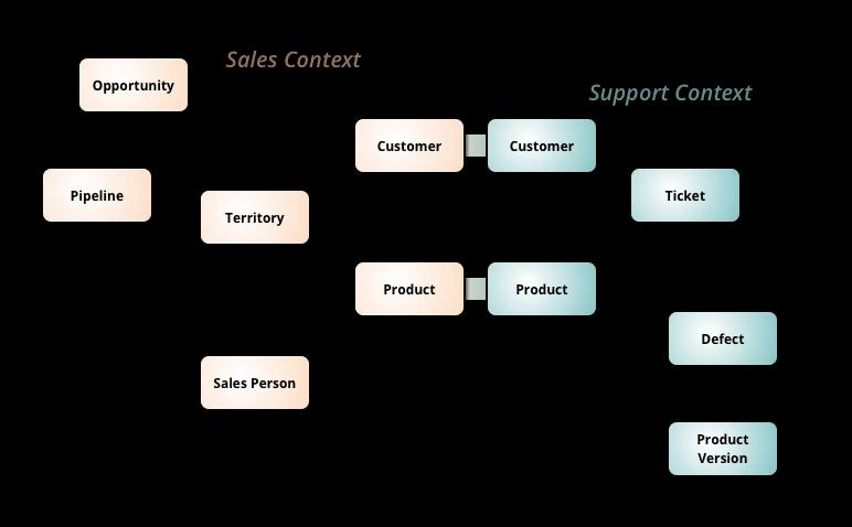 Das geht wahrscheinlich vielen so. Die wichtigste Begriff ist vermutlich Bounded Context. Stell dir vor, du hast ein sehr großes Modell mit vielen Entitäten und ein potenziell großes Team, das dieses Modell in Software gießen soll, dann ist das Prinzip der Bounded Contexts ein Mittel, mit dieser Komplexität klarzukommen. Modelle haben immer einen Kontext, jetzt geht es darum, diesen explizit zu machen und zu klären, wie die Verbindung zwischen den Kontexten aussieht. In dem Beispiel in Fowler’s Bliki haben wir zwei Kontexte, einmal Sales und einmal Support.