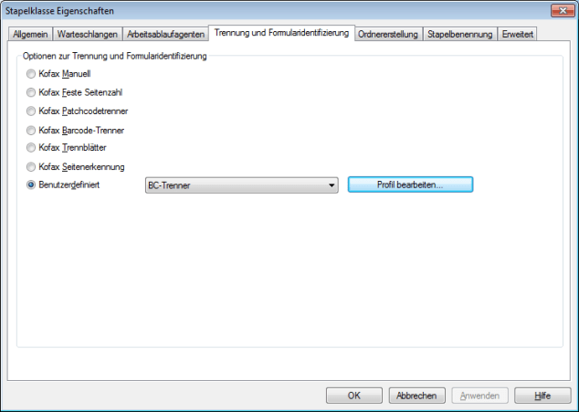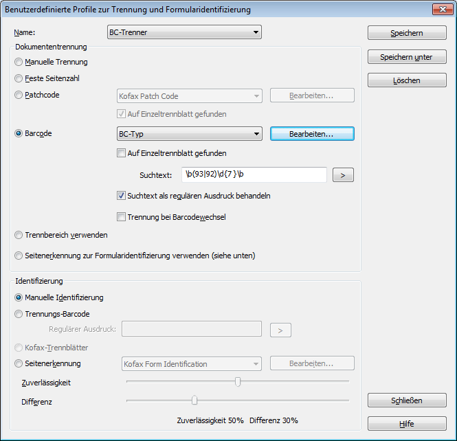 In Kofax Capture 10 kann man den benötigten regulären Ausdruck in den Eigenschaften der Stapelklasse definieren. In den Einstellungen zur ‚Trennung und Formularidentifizierung‘ legt man dazu ein benutzerderfiniertes Trennungsprofil an: