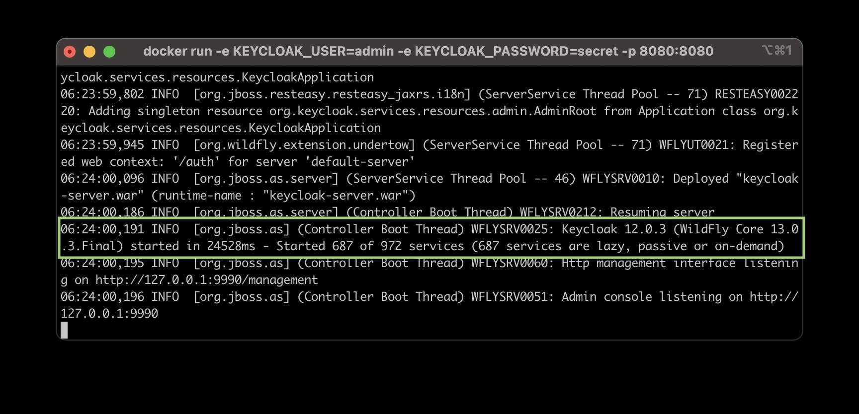 docker run -e KEYCLOAK_USER=admin -e KEYCLOAK_PASSWORD=secret -p 8080:8080 quay.io/keycloak/keycloak:12.0.3