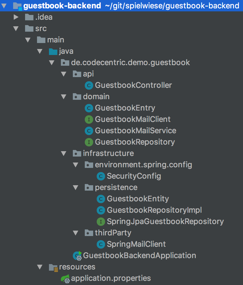 Im Package Infrastructure schließlich legen wir die konkreten Implementierungen für Probleme wie Persistenz und Kommunikation mit Third-Party-Services wie dem Mailservice an. Außerdem konfigurieren wir z.B. das tatsächlich eingesetzte Framework – in diesem Fall Spring Boot.