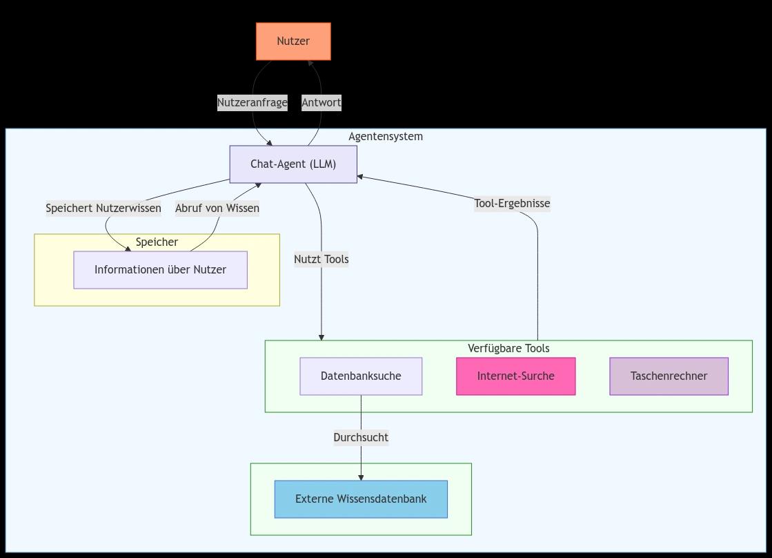 Architektur eines sehr einfachen KI-Agentensystem mit angebundenen Tools und Speicherfunktion für Informationen über den Nutzer