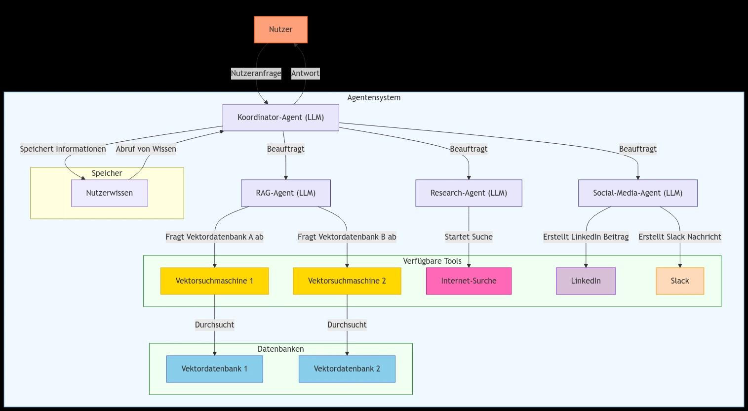 Architekturdiagramm eines Komplexeren KI-Agentensystems mit einem Koordinator-Agent für die Interaktion mit dem Nutzer und der Planung der Schritte, und mehreren spezialisierten Subagenten zum ausführen von dedizierten Aufgaben. Der Übersichtshalber sind die Antworten der Subagenten an den Koordinator-Agenten nicht auf dem Diagram verzeichnet.