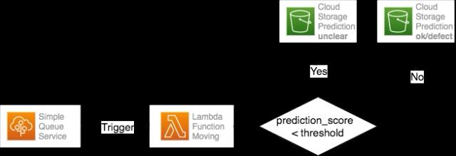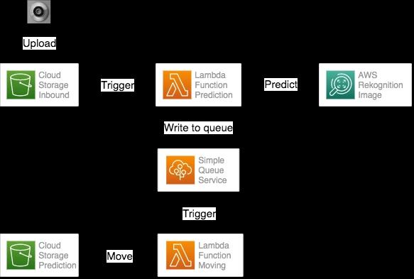 wird die Prediction-Funktion automatisch ausgeführt. Die Funktion klassifiziert das Bild mit dem Rekognition-Modell-Endpoint. Anschließend schreibt sie das Ergebnis auf in eine SQS-Queue. Hierdurch wird wiederum die Moving-Funktion getriggert. Diese beinhaltet die Logik, um die Bilder anhand des Klassifizierungsergebnisses zu sortieren.