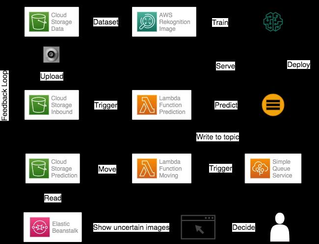 Die SQS-Queue triggert eine zweite Lambda-Function. Diese enthält die Verarbeitungslogik, um eingehende Bilder anhand des Ergebnisses der Klassifikation zu sortieren. Vorhersagen, deren Konfidenz unter einem vorher definierten Schwellwert liegen, werden als „unsicher“ definiert. Solche Bilder müssen in einem weiteren Schritt durch Facharbeiter*innen nachbearbeitet werden. Diese Nachbearbeitung kann über eine auf Elastic Beanstalk gehostete Demo-Anwendung beispielhaft durchgeführt werden.
