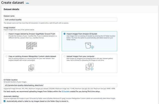 Nun kann in Rekognition der Trainings- und Testdatensatz erstellt werden. Hierzu importieren wir die Daten aus dem vorher angelegten S3-Bucket und setzen die Label automatisch anhand der Ordnerstruktur.