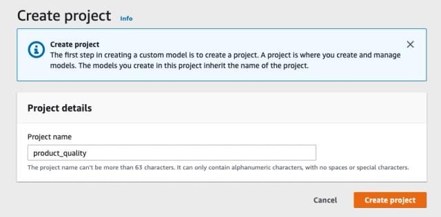Als nächstes erstellen wir ein Project in Rekognition, dieses dient insbesondere der Verwaltung zusammengehöriger Datensätze und Modelle.