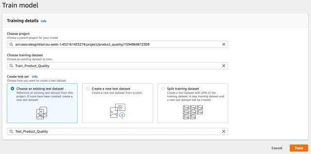 Nach dem Import ist es möglich, die Daten in Rekognition zu inspizieren. Dies ist vor allem hilfreich, um die Datenqualität selektiv zu begutachten. Jetzt kann das Training des Modells gestartet werden. Hierzu wählen wir den vorher erstellten Training- und Testdatensatz aus.