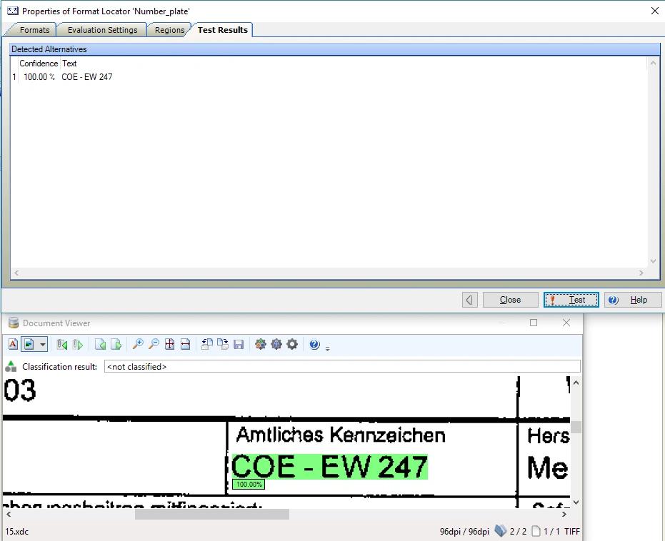 Dies ist beim ersten Beispiel der Fall: „COE – EW 247“. Das zweite Beispiel „COE.EW.247“ hat Punkte als Trenner zwischen den einzelnen Teilen des Kennzeichens, und die Einbindung des Wörterbuchs funktioniert nicht wie gewünscht.