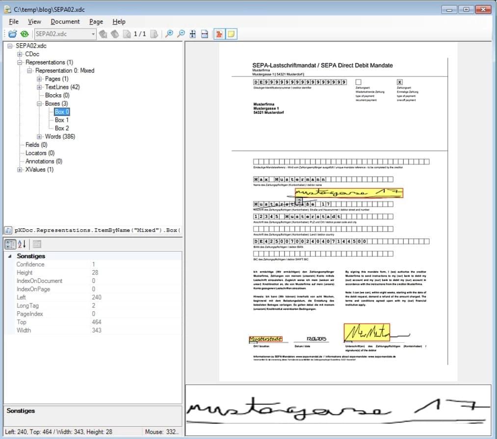 Allerdings liefert die Engine Informationen, ob Handschrift überhaupt gefunden wurde. Handschriftliche Kandidaten werden mit sogenannten ‚Boxes‘ gekennzeichnet. Diese kann man sich sehr gut mit dem XDOC Browser aus der KTM-Installation anschauen. Dazu lässt man über ein Dokument zunächst die ‚Gemischte Schrift‘-Engine laufen und schaut sich die daraus resultierende xdc-Datei mit dem XDOC Browser an: