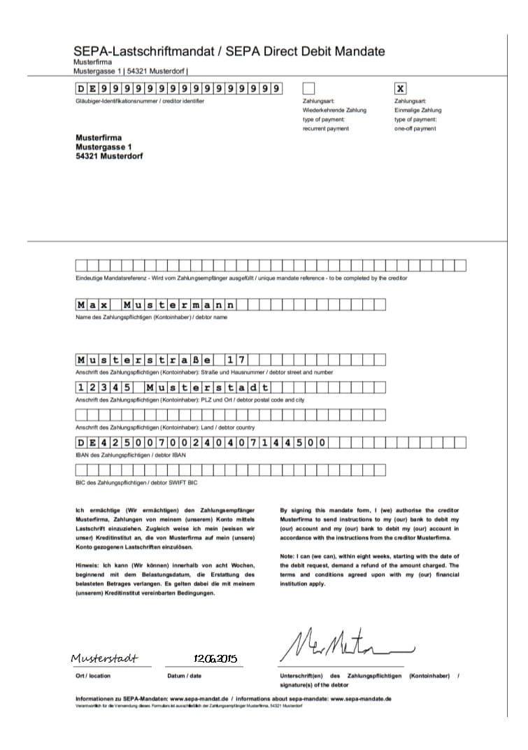 Hier ein Beispiel eines vollständig maschinell ausgefüllten und vom Kunden unterschriebenen SEPA-Mandats:
