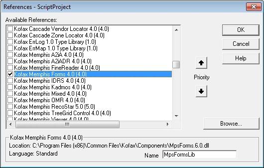 Damit das Beispiel funktioniert muss im KTM Scripting noch eine Referenz auf ‚Kofax Memphis Forms 4.0‘ gesetzt werden:
