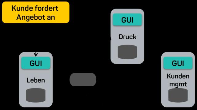 Hier schickt der Lebenangebotsservice ein AngebotAngefordertEvent, auf das sich andere Services registrieren können. Im Beispiel ist das ein Druckservice, der ein PDF mit dem Angebot erzeugt, und ein Kundenmanagementservice, der Daten darüber sammelt, wer welche Angebote angefordert hat. Sinnvoll also bei Fire-and-Forget-Szenarien.