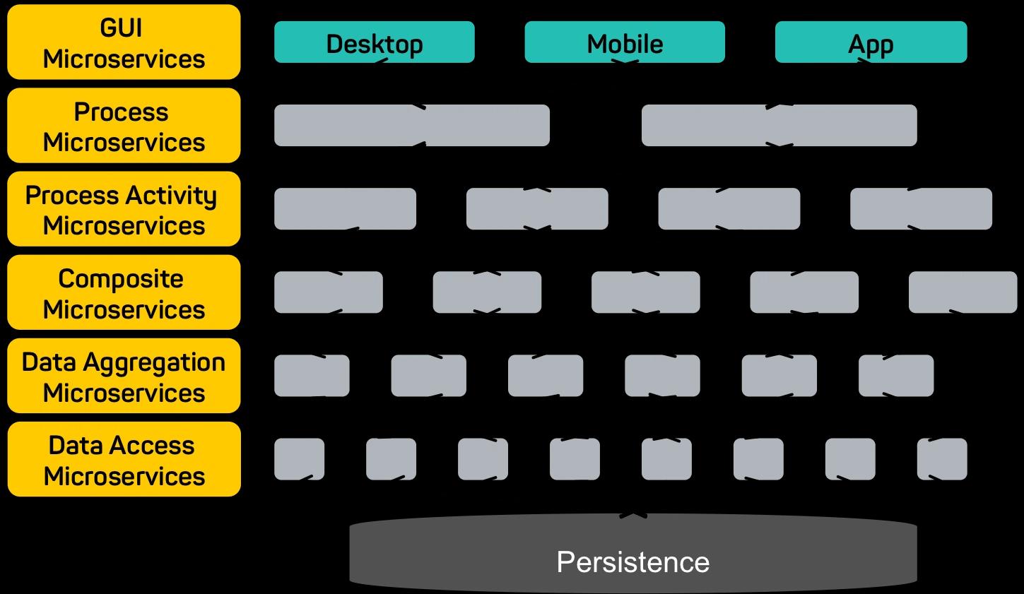 Ich gehe davon aus, dass wir von Full-Stack-Microservices reden, die Persistenz und Fachlogik für einen bestimmten Bounded Context beinhalten. Vor kurzem bin ich mal wieder über eine Folie gestolpert, in der der Autor wie in der folgenden Grafik diverse Schichten aufgezeichnet hatte.