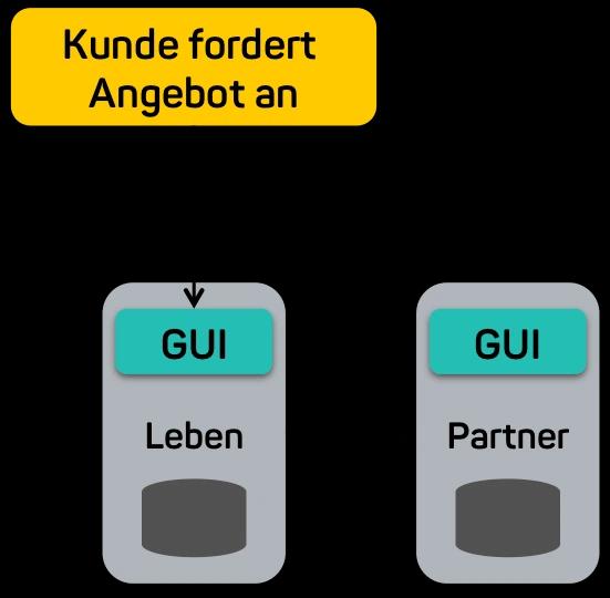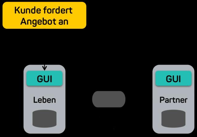 In diesem konkreten Beispiel möchte ein Kunde ein Angebot für eine Lebensversicherung berechnen lassen. Der Lebenangebotsservice benötigt für die Berechnung allerdings das Geburtsdatum des Kunden und holt sich dieses über einen synchronen Aufruf des Partnerservices. Diese Art der Kommunikation ist wohl die am stärksten verbreitete.