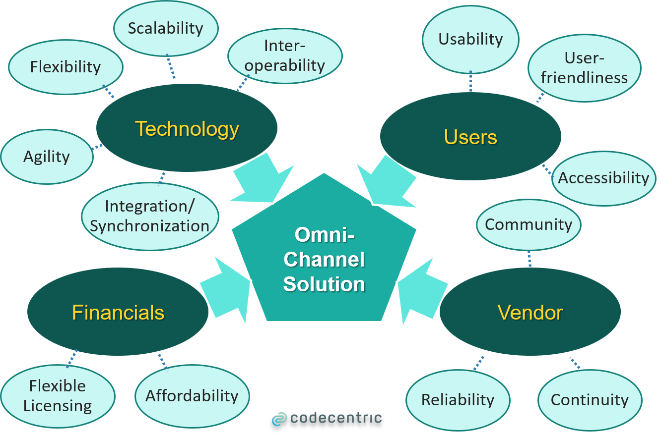 Die Entscheidung, welche Kanäle die Kernfunktionen einer Omni-Channel-Lösung sein sollten und welche nahtlos integriert werden können, ist nicht ganz so trivial zu treffen. Sie hängt von verschiedenen zusammenhängenden Faktoren ab, darunter die spezifischen Anforderungen an die Kanäle, Lizenzmodelle, technische Einschränkungen (z. B. Netzwerkgeschwindigkeit) und die allgemeine Reife der Hauptplattform. Schließlich hängt es auch davon ab, wie sehr die Entscheidungsträger bereit sind, sich von einem „laufenden“ System zu verabschieden und wie tief ein chirurgischer Eingriff in die Unternehmensarchitektur möglich und erwünscht ist.