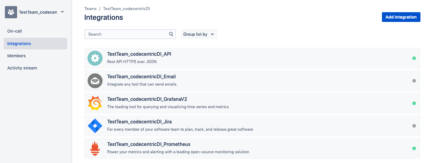 Wie auf dem Bild zu erkennen, ist eine Integration für Grafana schon eingerichtet. Hier findet man auch den API-Key und die URL. Nun sind die beiden Tools miteinander verbunden. Entsprechend der Einstellungen von OpsGenie werden die Alerts von Grafana nun als Sprachnachricht, SMS oder E-Mail an die entsprechenden Personen des Teams weitergeleitet.