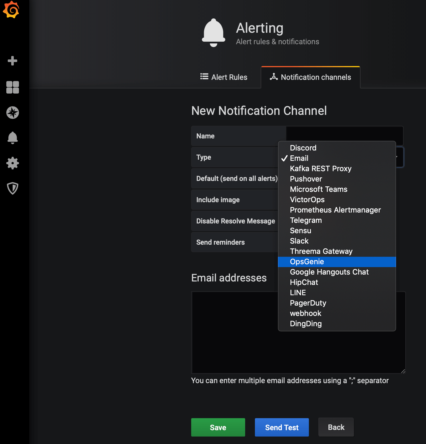 Als erstes werde ich nun einen Notification Channel angelegen, und zwar konkret für OpsGenie. Auf dem Bild sind noch viele weitere Kanäle erkennbar. Für die Integration mit OpsGenie wird ein API-Key und eine URL benötigt.