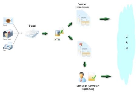 Für Punkt 1. wurde das Kofax Produkt KTM (Kofax Transformation Modules) eingesetzt, welches sich nahtlos in das vorhanden Erfassungssystem Kofax Capture integriert. Die damit automatisch erkannten Daten werden – falls möglich – zur Absicherung gegen die Datenbestände des CRM-Systems geprüft.