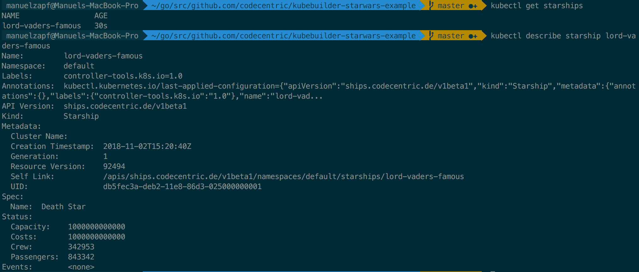 Um dem Ganzen ein bisschen näher zu kommen, habe ich ein Demo-Projekt vorbereitet. Dieses benutzt den Custom CRD „Starship“, um sich entsprechende Daten aus der bekannten Star Wars API zu laden.