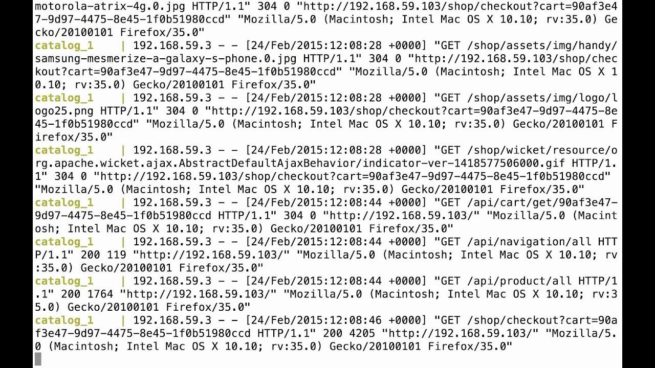 1bz@cc ~$ docker-compose up -d 2.... 3bz@cc ~$ docker ps 4CONTAINER ID IMAGE COMMAND CREATED STATUS PORTS NAMES 52730bad656eb zutherb/catalog-frontend:latest "dockerize -template 8 seconds ago Up 7 seconds 443/tcp, 0.0.0.0:80->80/tcp fig_catalog_1 63ba6e424506e zutherb/navigation-service:latest "/navigation-0.6/bin 10 seconds ago Up 8 seconds 0.0.0.0:18090->18090/tcp fig_navigation_1 7db169f173cef zutherb/monolithic-shop:latest "/sbin/my_init" 12 seconds ago Up 10 seconds 0.0.0.0:8080->8080/tcp fig_shop_1 84db1ae8b366e zutherb/cart-service:latest "/cart-0.6/bin/cart" 13 seconds ago Up 12 seconds 0.0.0.0:18100->18100/tcp fig_cart_1 9392fc3da4cfe zutherb/product-service:latest "/product-0.6/bin/pr 15 seconds ago Up 13 seconds 0.0.0.0:18080->18080/tcp fig_product_1 10fd0ed6323975 redis:latest "redis-server /etc/r 16 seconds ago Up 14 seconds 0.0.0.0:6379->6379/tcp fig_redis_1 11dbcbc99d4fb6 mongodb:latest "mongod" 17 seconds ago Up 16 seconds 28017/tcp, 0.0.0.0:27017->27017/tcp fig_mongodb_1 125efc445dbbbd dockerui/dockerui:latest "./dockerui" 19 seconds ago Up 17 seconds 0.0.0.0:9000->9000/tcp fig_dockerui_1 13bz@cc ~$ docker-compose stop