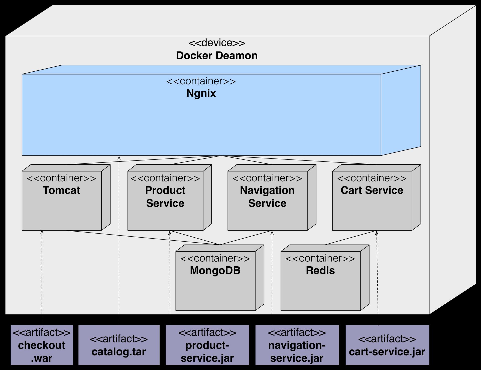 Wie man durch das vorherige Listing sieht, sind schon zum Erstellen von einfachen Anwendungen mehrere Kommandos nötig. Das folgende Verteilungsdiagramm lässt erahnen, wie kompliziert das Ganze mit einer wachsenden Zahl von Microservices wird. Es wäre doch schön, wenn man eine Möglichkeit hätte, um solche komplexen Deployment-Szenarien zu beschreiben.