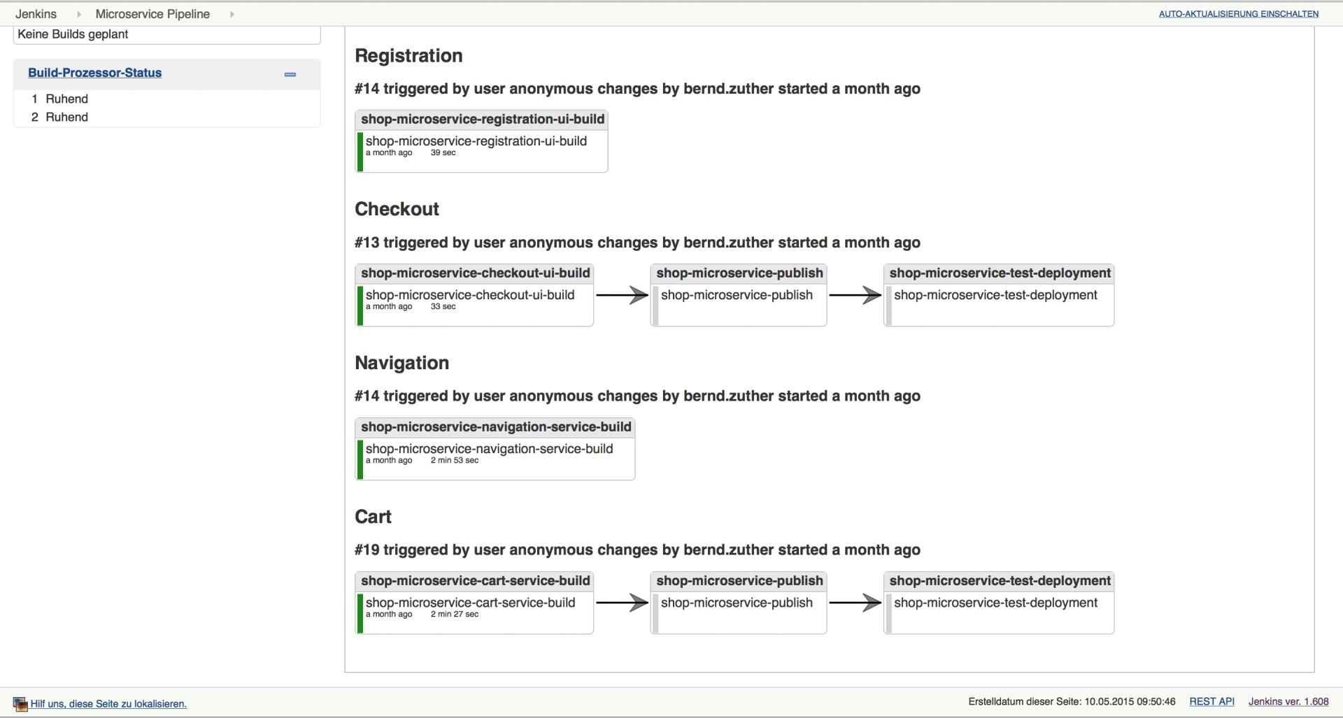 Mit reprepro kann man sich sehr einfach eine Multi-Deployment-Pipeline aufbauen. Am Ende jedes einzelnen Builds pusht man das entstandene Debian-Paket mit dem Komando includedeb in die Paketquelle. Auf dem Zielrechner muss man nun die Paketquelle bekannt geben und kann den Warenkorb-Microservice ganz einfach mit dem Kommando apt-get install shop-cart-service installieren. Wie eine solche Multi-Deployment-Pipeline auf dem Jenkins Buildserver aussieht, zeigt die folgende Darstellung.