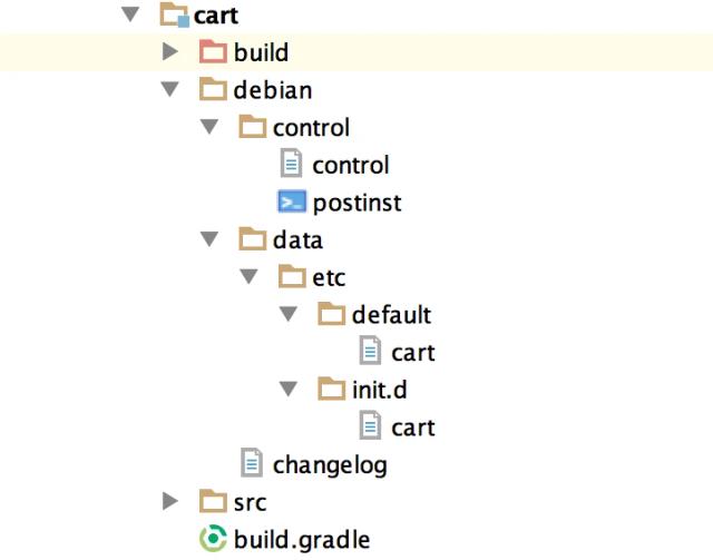 Im src-Verzeichnis liegt der Quellcode des Warenkorb-Microservice. Wie man an der build.gradle erkennen kann, wird das Projekt mit dem Buildwerkzeug Gradle gebaut. Wie bekommt man nun alle Teile zusammen, um ein Debian-Paket zu erhalten? Es ist sinnvoll das Bauen eines Debian-Pakets in den Anwendungsbuild zu integrieren. Mit JDeb gibt es eine Java-Bibliothek, um Debian-Pakete zu erstellen. Diese Bibliothek ist plattformunabhängig und baut Debian-Pakete ohne die Installation von irgendwelchen zusätzlichen Tools. Es gibt auch ein Gradle-Plugin , das auf JDeb basiert. Das folgende Listing zeigt die Verwendung dieses Plugins zusammen mit dem Spring-Boot-Plugin , dass das Gradle-Application-Plugin erweitert und den Teil der build.gradle, der für das Bauen eines Debian-Pakets verantwortlich ist: