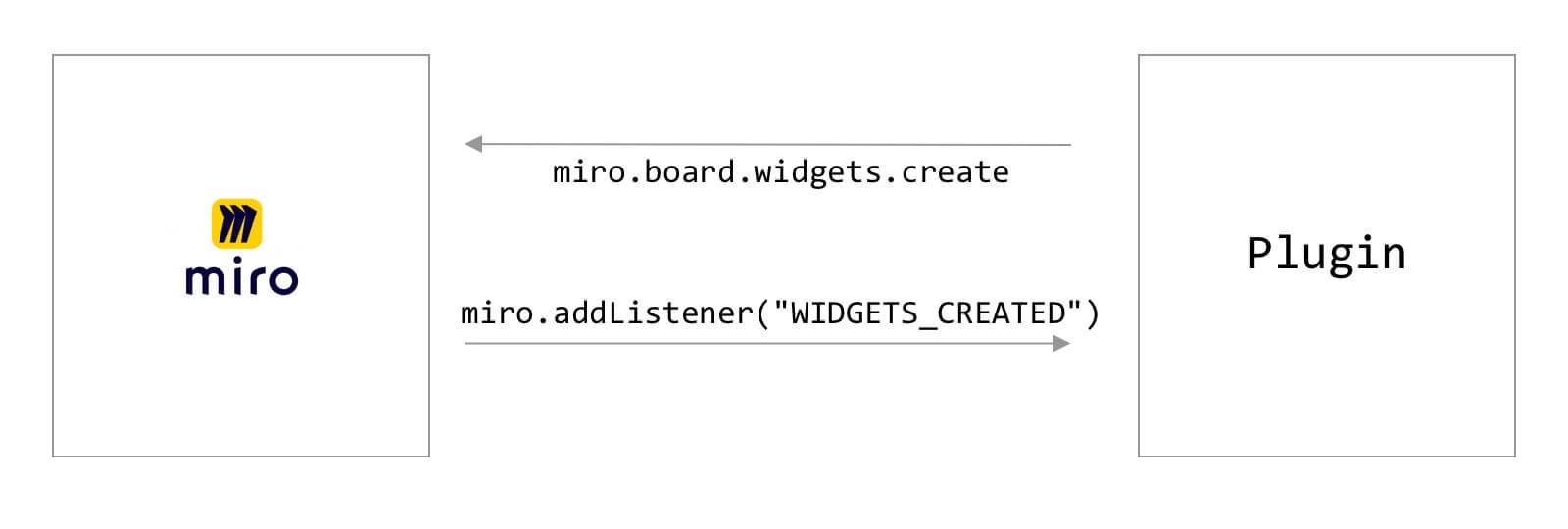 Das Miro-Objekt erlaubt dem Entwickler die Kommunikation in zwei Richtungen. Zum einen kann er über Methoden Einfluss auf die Inhalte des geöffneten Miro Boards nehmen, zum anderen kann sich über Events über Änderungen im Miro Board benachrichtigen lassen: