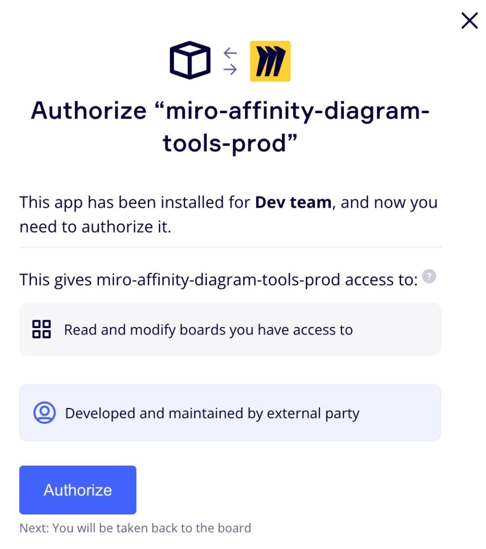 Hinweis: in diesem Dialog werden dem Benutzer auch die Berechtigungen angezeigt, die das Plugin einfordert. Diese werden allerdings nicht beim Aufruf von requestAuthorization festgelegt, sondern bereits beim Anlegen der App in Miro. Über das Berechtigungskonzept wird gesteuert, auf welche Aspekte eines Miro Boards das Plugin Lese- oder Schreibzugriff hat. Mehr zum Berechtigungskonzept findet ihr hier: https://developers.miro.com/docs/add-permission-scopes-to-your-app