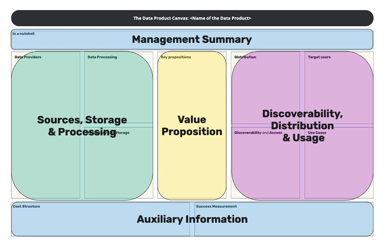 Um alle wesentlichen Informationen hinsichtlich eines Datenprodukts abzubilden, teilt sich unser Data Product Canvas in 5 Bereiche mit insgesamt 11 Feldern auf. Über allem steht eine klar verständliche Management Summary, die (nicht nur) für das Management klar und deutlich beschreibt, was die Kernidee dieses Data Products ist.