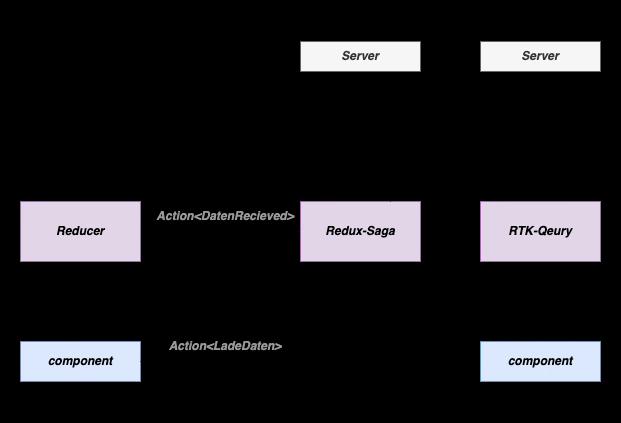 Vergleich Redux-Saga (links) und RTK Query (rechts)