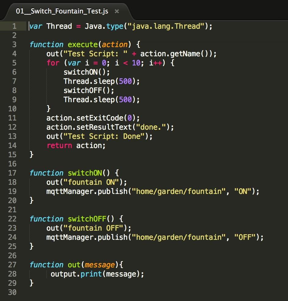 Genutzt wird dabei die Nashorn Engine, die JavaScript-Programme ausführt und seit Java 8 zu den Bordmitteln gehört. Innerhalb des Scripts kann z. B. mittels des gebundenen mqttManager-Objekts über die bestehende Brokerverbindung „gepublished“ und „subscribed“ werden.