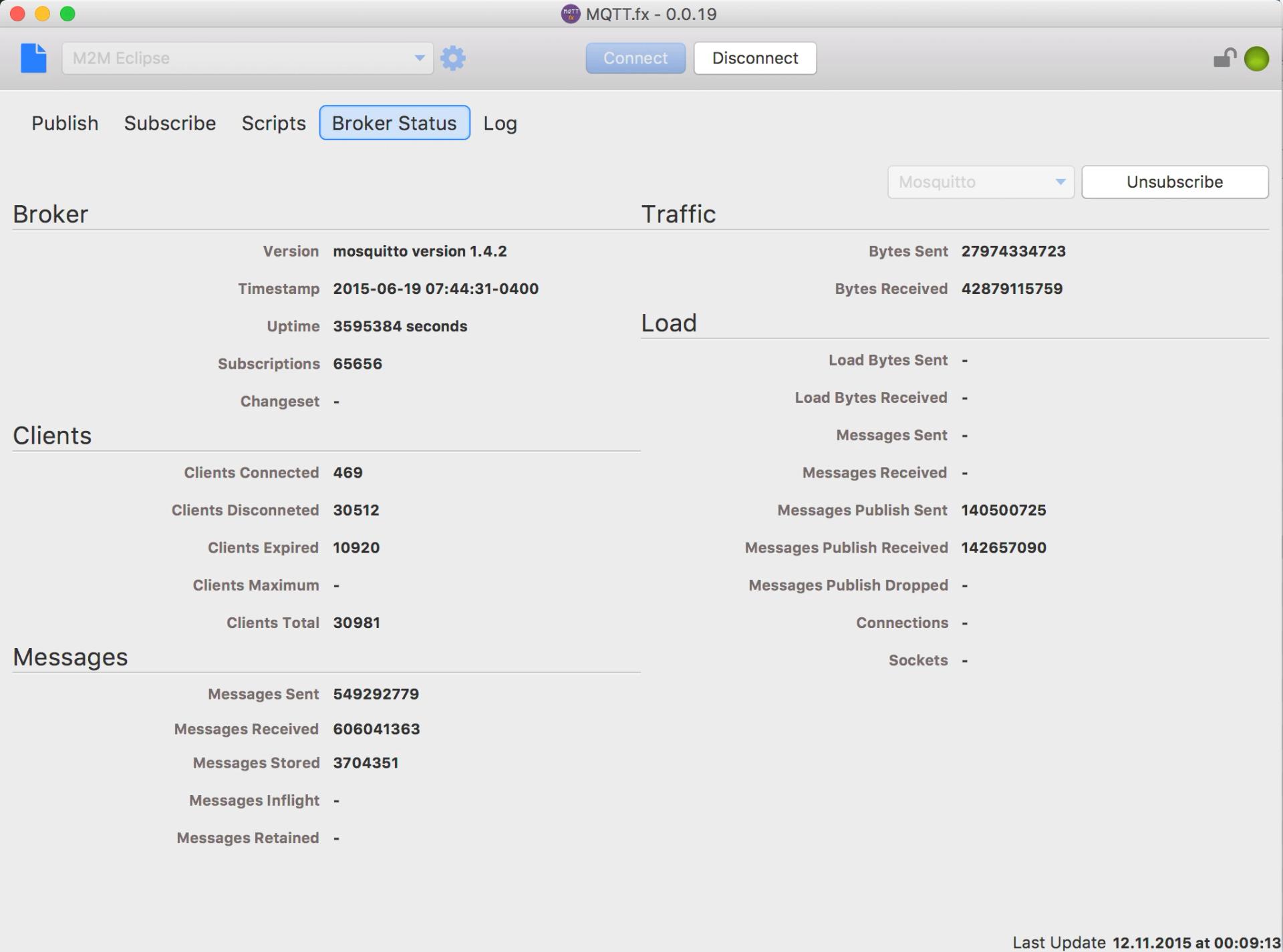 Einige Broker senden über eine $SYS-Topic-Hierarchie eigene Statusinformationen, z. B. Versionsinformationen über das Topic $SYS/broker/version oder die Uptime über $SYS/broker/timestamp. Diese $SYS-Topics variieren etwas je nach Broker. Im Moment werden hier von MQTT.fx die Broker mosquitto und HiveMQ unterstützt.