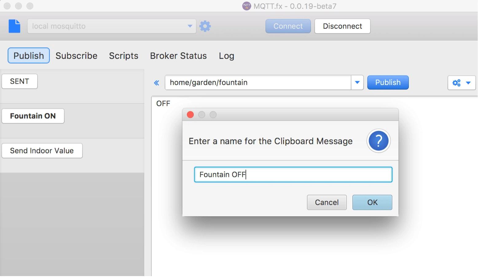 MQTT.fx bietet die Möglichkeit, Nachrichten inkl. dazugehörigem Topic auf einer Ablage zu speichern (zum Beispiel zum wiederholten Ein- oder Ausschalten von Aktoren).