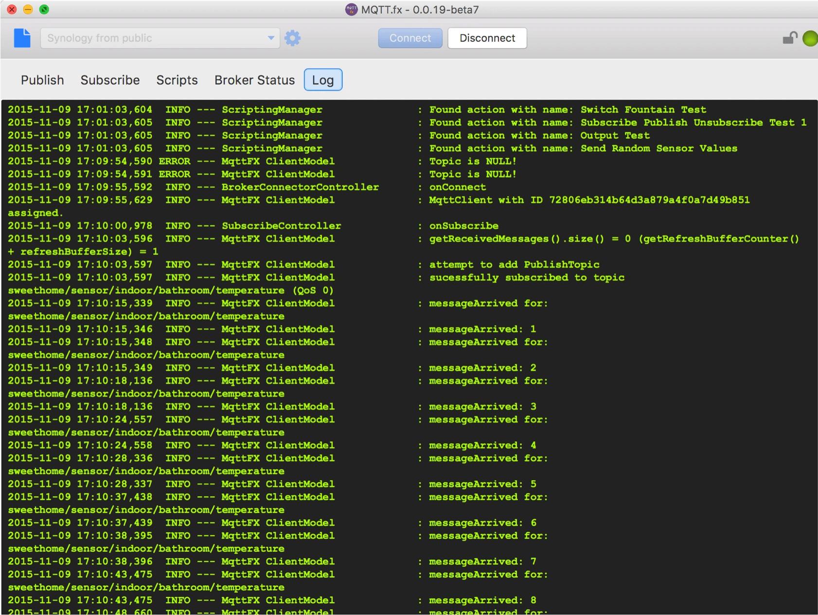 Das Tab „Log“ zeigt die Logging-Konsole an, auf der alle MQTT.fx-Aktionen aufgezeichnet werden: