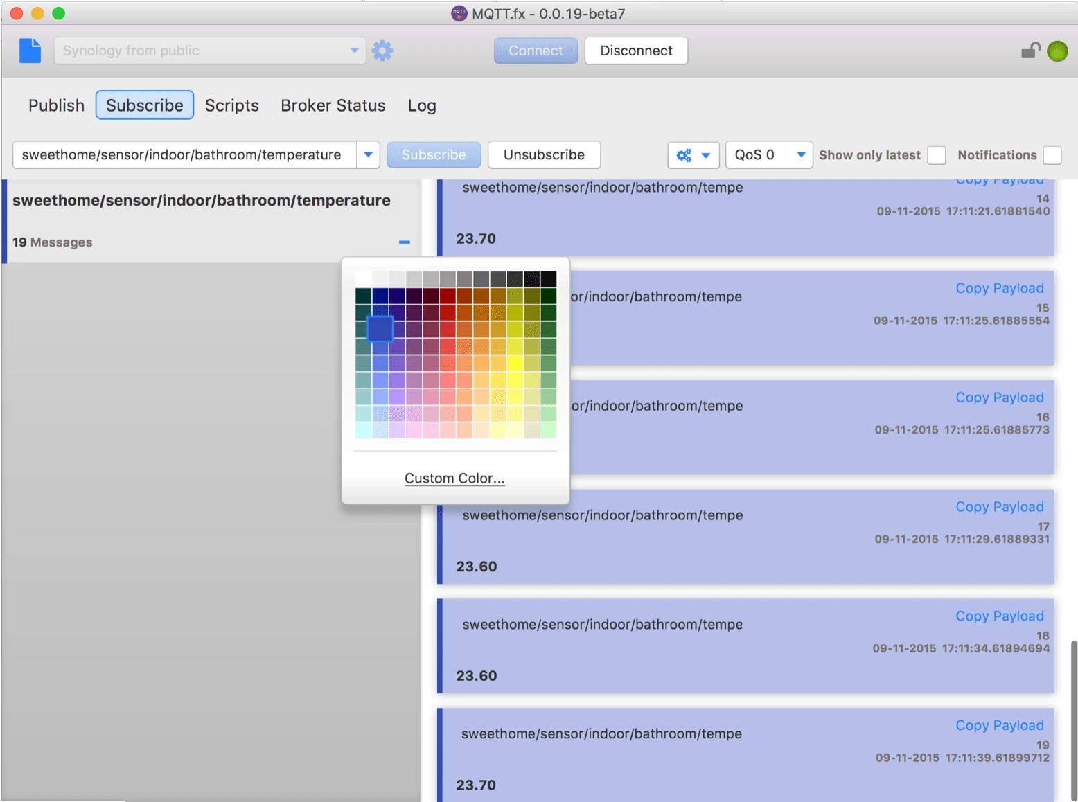 Abonnierte Topics werden farbig markiert und empfangene Nachrichten zur leichteren Zuordnung entsprechend der Topicfarbe gekennzeichnet. Die jeweilige Farbe für ein Topic kann bei Bedarf angepasst werden und wird auch in der Konfiguration gespeichert.