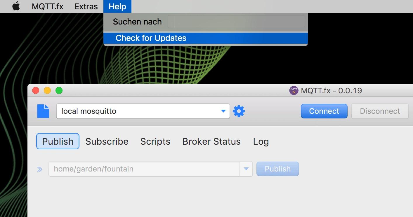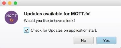Automatisch beim Start oder über das Menü kann nach bereitgestellten neuen MQTT.fx-Versionen gesucht werden: