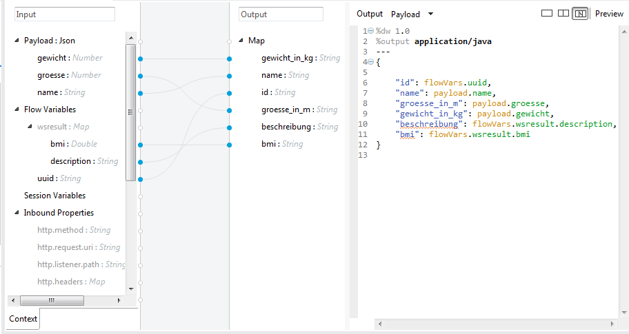 Bevor ich tiefer in das Thema einsteige, noch eine Ergänzung zum ersten Teil. Dort hatte ich geschrieben , dass es bei DataWeave (im Gegensatz zum alten DataMapper) kein grafisches Mapping mit Drag and Drop gibt. Stimmt nicht (mehr): Mitte Dezember kam mit einem Update des AnypointStudio das grafische Mapping für DataWeave. Der Editor hat dazu eine weitere Spalte erhalten, in der die Zuordnung grafisch durch Linien dargestellt wird: